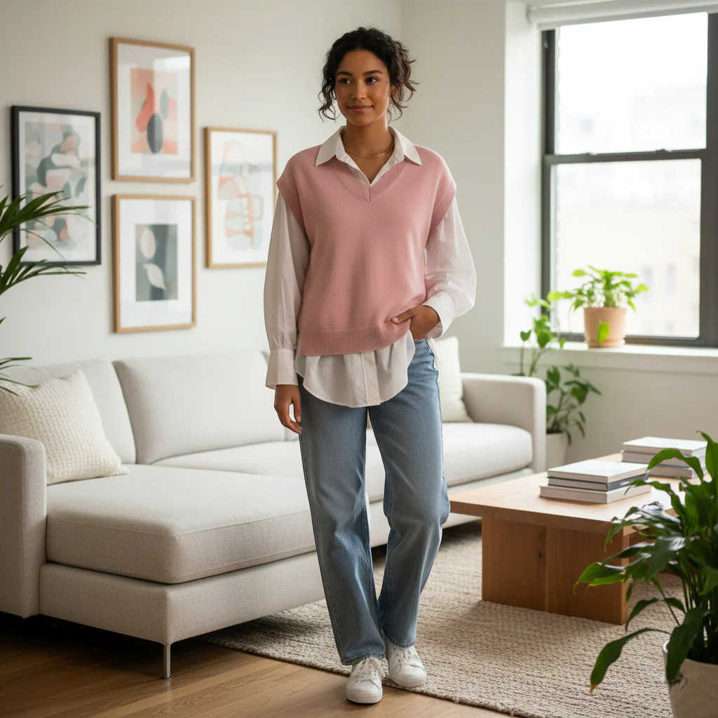 Le pull rose se prête aussi aux superpositions. Porté sur une chemise blanche, il apporte une touche chic et contemporaine. En version oversize, il crée un effet décontracté tout en restant féminin. Enfin, un pull sans manche rose, combiné à une chemise légère, devient la pièce tendance idéale pour la mi-saison.